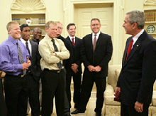 The nine-time national champion Augsburg wrestling team met with President George W. Bush at the White House on Wednesday afternoon. The visit was delayed from its original date of Sept. 8.
